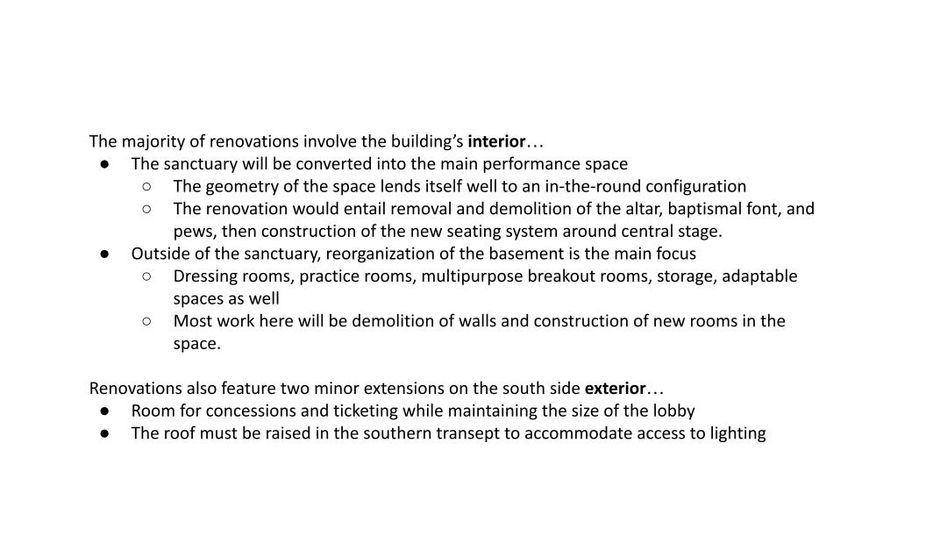 From October 2022 to March 2023 I collaborated with a team of graduate students to transform a local Baptist church into a community theater. With backgrounds in scenic design, architecture, and industrial design we conducted site visits, developed a renovation plan, drafted blueprints, interviewed users, all under the direction of industry professionals.